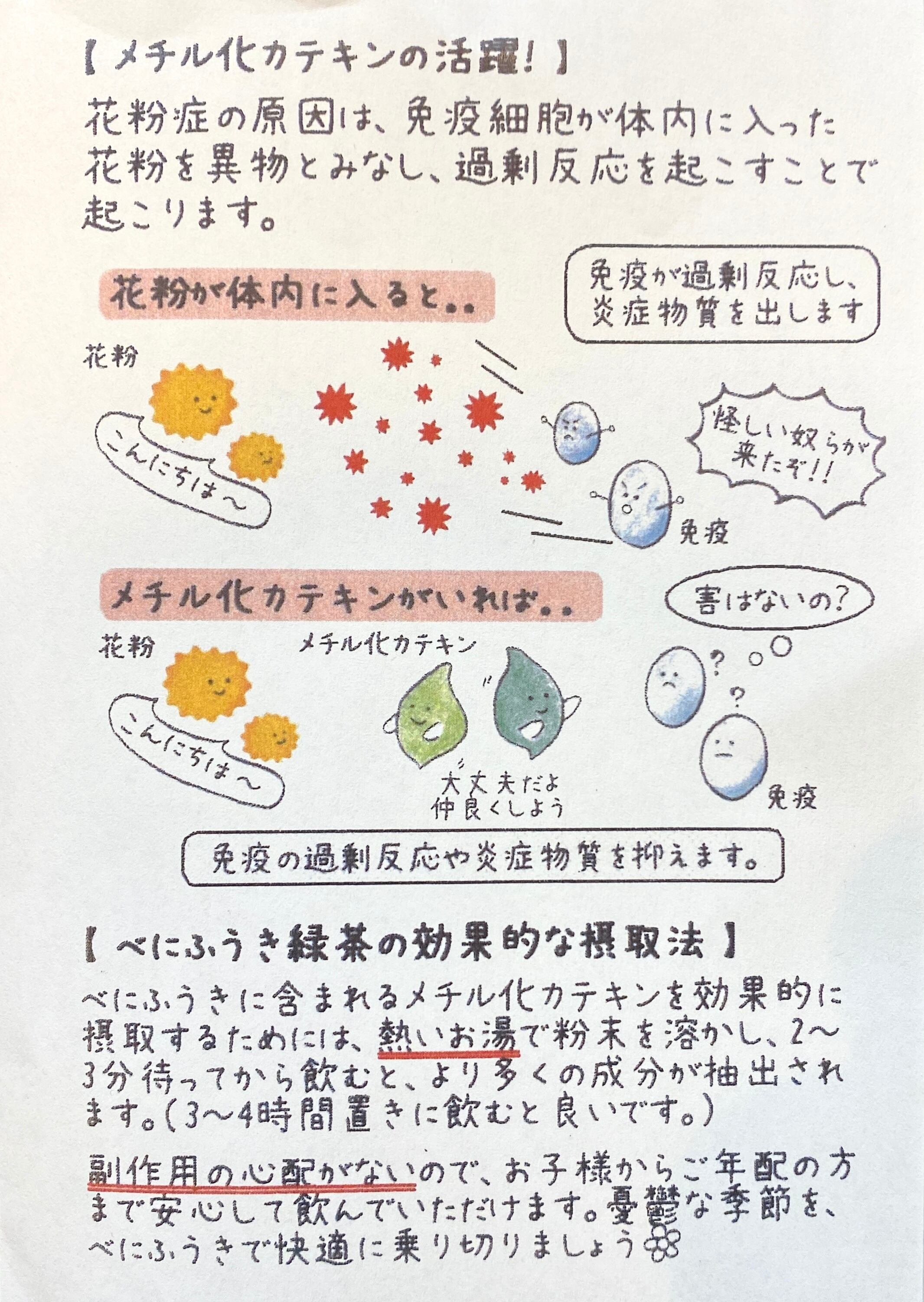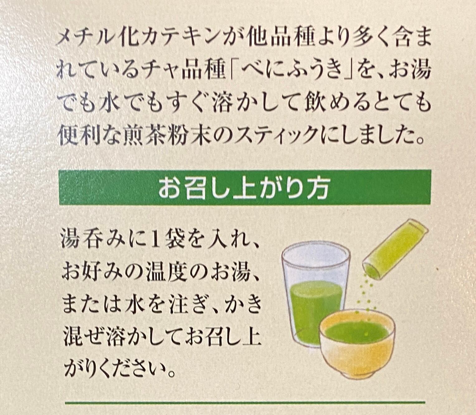 メチル化カテキンが他品種より多く含まれている品種[べにふうき]を、お湯でも水でもすぐ溶かして飲める、とても便利な煎茶粉末のスティックにしました。